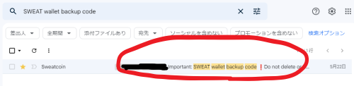 で、何やらちゃんと読んでみると(なんで読まなかった?っていうツッコミは受け付けます。)「Important: SWEAT wallet backup code!Do not delete or share!」って書いてあるメール、送ってあるじゃん?そこにログイン出来るボタンあるから!
