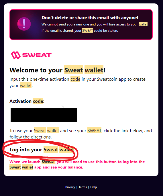 I saw an email that said, “Important: SWEAT wallet backup code! Do not delete or share!”